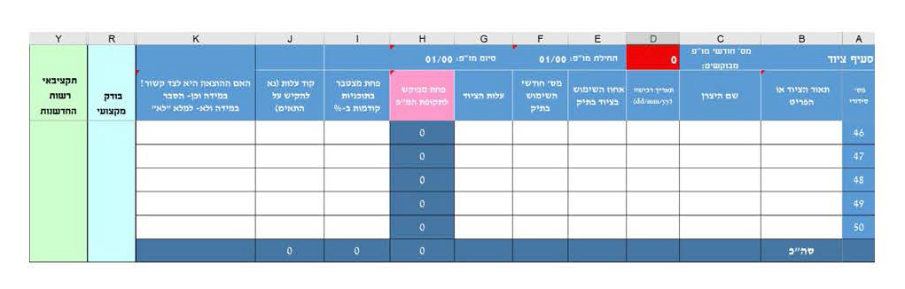 • יש למלא את התאים הלבנים: טור G-B. תאים שלא ימולאו, יגרמו לבעיה בסכימה בטור H ואי אפשר יהיה לבדוק את הבקשה. כמו כן, יש למלא את התאים הלבנים: טורI-K