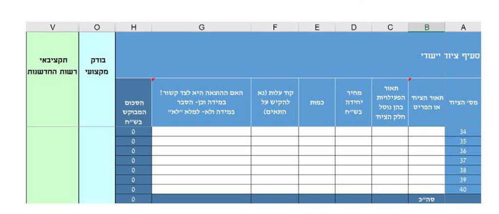 • בהתאם לנוהלי הרשות, הוצאות ציוד ייעודי מוכרות רק עבור המסלולים בהם הסעיף הנ"ל מוכר (ע"פ נוהל 200-02 או ע"פ נוהלי המסלול המסוים). ביתר המסלולים לא יוכרו הוצאות ציוד ייעודי וגיליון זה לא ייפתח למילוי