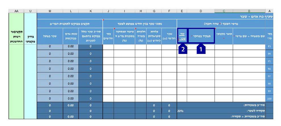• התאים הכחולים מחושבים אוטומטית (עמודה M סוכמת את נתוני השכר בפועל כפי שהוזנו. עמודה K סוכמת את נתוני השכר בהתאם לתקרות הרשות המפורטות בנוהל 200-02)