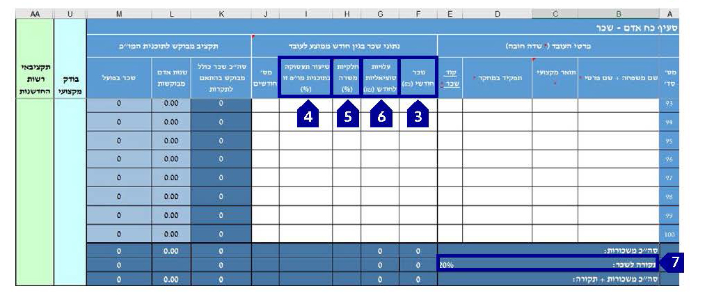 • בעמודה G (עלויות סוציאליות לחודש) יש לציין את ההוצאות הסוציאליות של העובד. כלומר, תשלומים עבור הטבות סוציאליות להן זוכה העובד ואינן כלולות בתלוש השכר, כמו דמי ביטוח לאומי (חלק המעביד), הפרשות לקרנות גמל שונות, הפקדה לפיצויים, ביטוח מנהלים בקופה המאושרת וכו' 6