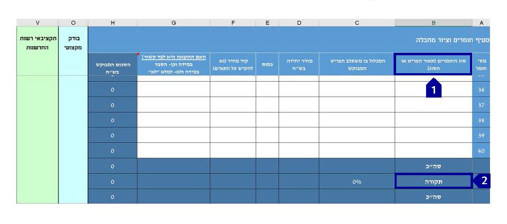 • בעמודה B (סוג החומרים) יש למלא גם את יחידות המידה של החומרים. בחומרים הכוונה לחפצים ולרכיבים מתכלים או נצרכים במלואם בתקופת הביצוע המאושרת או נדרשים לבניית אב-טיפוס/מתקן הרצה ואין להם שימוש אחר 1