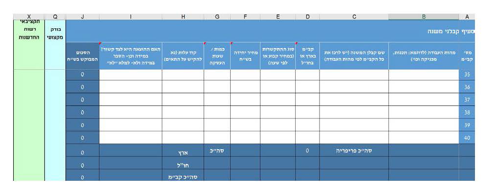 • אם יש קבלני משנה שטרם נקבעו או אינם ידועים, יש לתקצב את שכרם ולרשום בעמודה C (שם קבלן המשנה) "טרם נקבע"