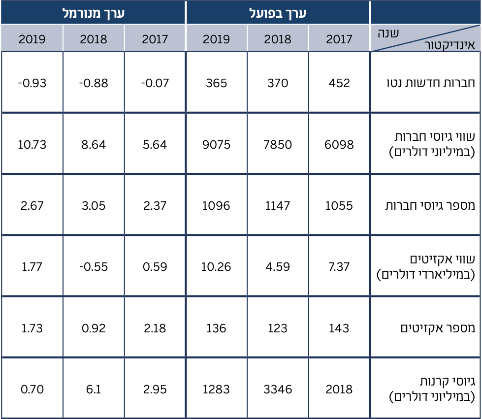 - גיוסי קרנות: סך הכספים שגייסו קרנות הון סיכון ישראליות בשנה. נתון זה מהווה אינדיקציה לעתיד ההשקעות הצפוי של אותן קרנות בישראל.