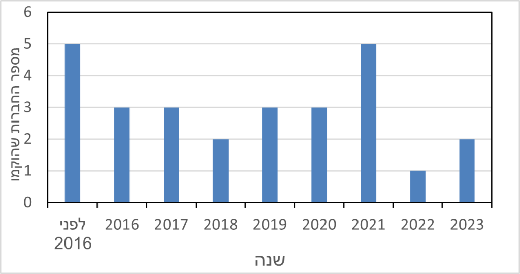 בחיפוש נמצאו 27 חברות שפעילות בישראל. מהן 19 קיבלו תמיכה מרשות החדשנות עד היום (70%). הנתונים המוצגים בגרף להלן מראים כי רוב החברות (20) הוקמו בין השנים 2023-2016. שנת 2021 הייתה שנת השיא בה הוקמו 5 חברות. באותה שנה החלה לפעול גם מעבדת החדשנות AIONLABS שהחברות שהוקמו בה עד היום (6) אינן כלולות בספירה לעיל.