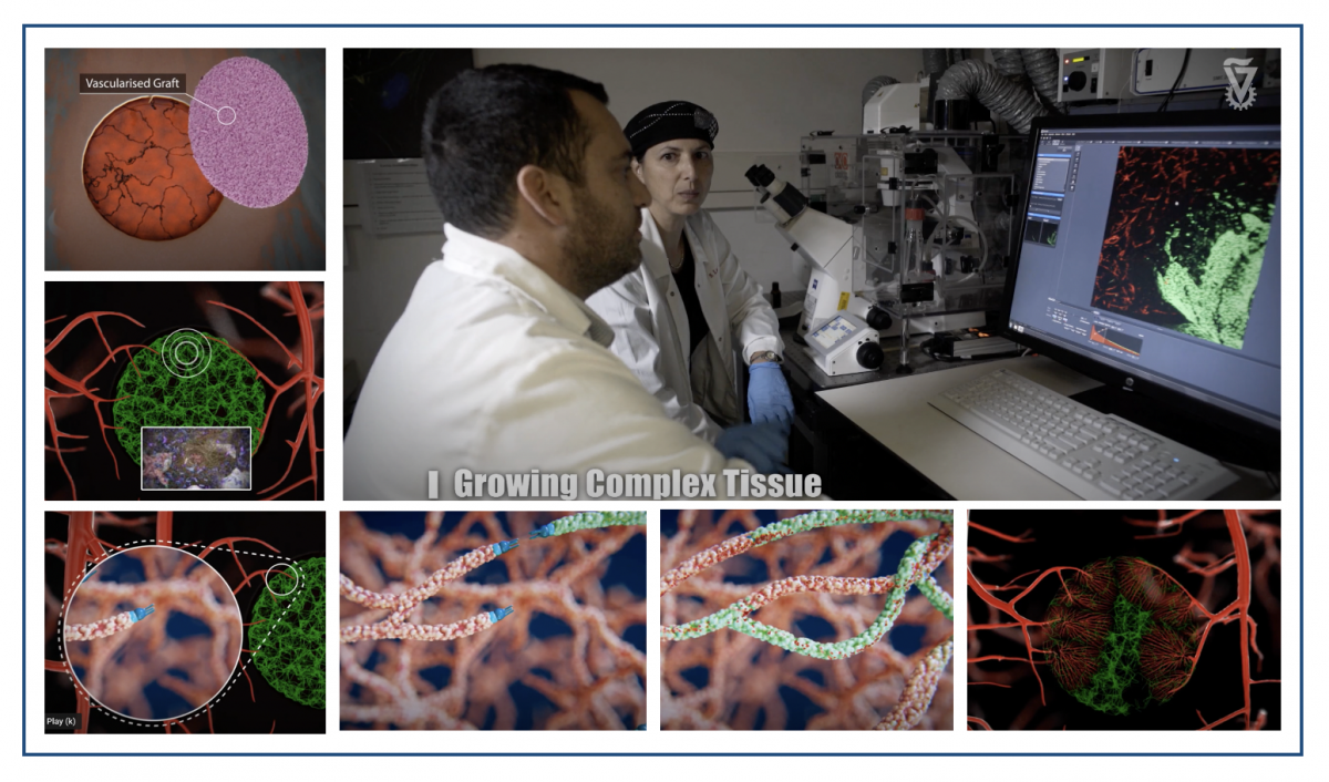 “לאורך השנים הראינו שאם מייצרים ברקמה שבמעבדה רשת כלי דם, זה עוזר להתחברות הרקמה אחרי ההשתלה. את הכיוון הזה של יצירה תלת ממדית של צינורות בתוך הרקמה אנחנו מיישמים בייצור של רקמת שריר – למשל שריר בטן או שריר לב.