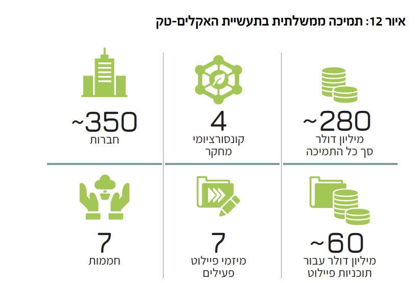 - מתוך 10 קבוצות המשקיעים הפעילות ביותר בתחום בישראל, ארבע מפעילות חממה טכנולוגית הנתמכת על-ידי הממשלה, נתון זה מדגיש את חשיבות התמיכה הממשלתית בתחום פתרונות האקלים.