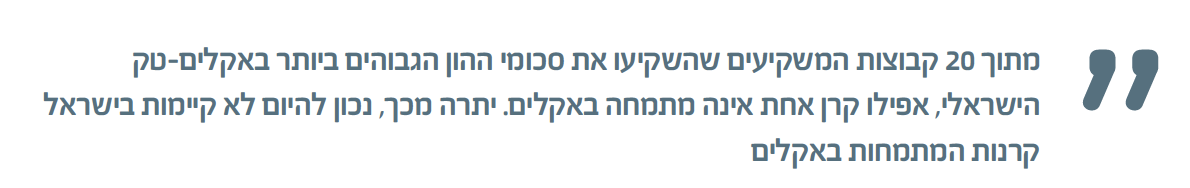 - מתוך 20 קבוצות המשקיעים שהשקיעו את סכומי ההון הגבוהים ביותר באקלים-טק הישראלי, אפילו קרן אחת אינה מתמחה באקלים. יתרה מכך, נכון להיום לא קיימות בישראל קרנות המתמחות באקלים.