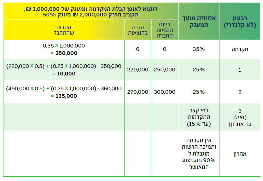 שימו לב! שיעור המקדמה יבוצע באופן הדרגתי במהלך תקופת הביצוע המאושרת של התיק על פי הפירוט הבא*: