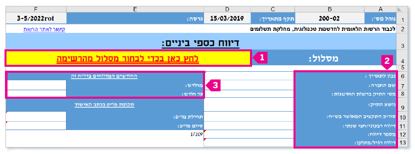 2. על החברה למלא את כל התאים הלבנים: שורות 13-6. אחרת, אי אפשר יהיה לבדוק את הדיווח. 2
