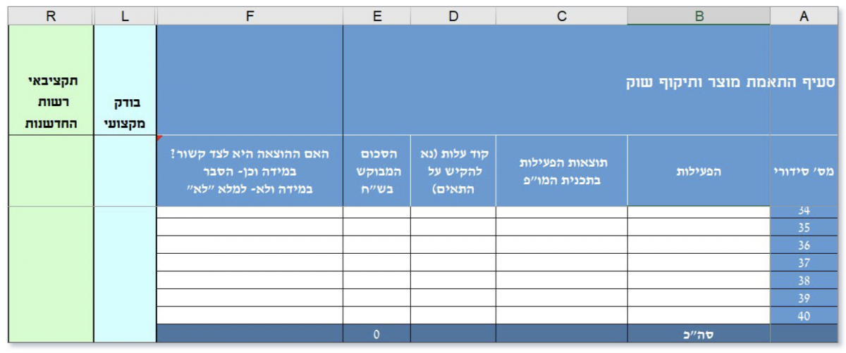 - בעמודה E (הסכום המבוקש בש”ח) יש לוודא כי סך הוצאות “התאמת מוצר ותיקוף שוק” יחד עם הוצאות שנרשמו בגיליון “כוח אדם – שכר” (לצורך תיקוף שוק בלבד) והוצאות שנרשמו בגיליון “קבלני משנה” (לצורך תיקוף שוק בלבד) לא חורגים מ-15% מסך התקציב המאושר או 15% מסך ההוצאה בפועל