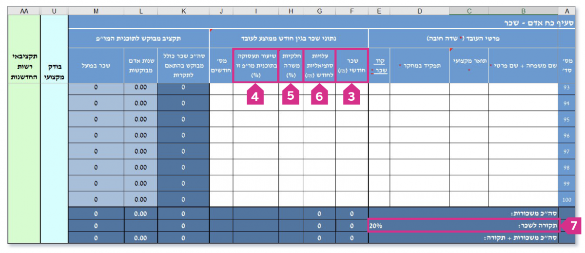 - התאים הכחולים מחושבים אוטומטית (עמודה M סוכמת את נתוני השכר בפועל כפי שהוזנו. עמודה K סוכמת את נתוני השכר בהתאם לתקרות הרשות המפורטות בנוהל 200-02)