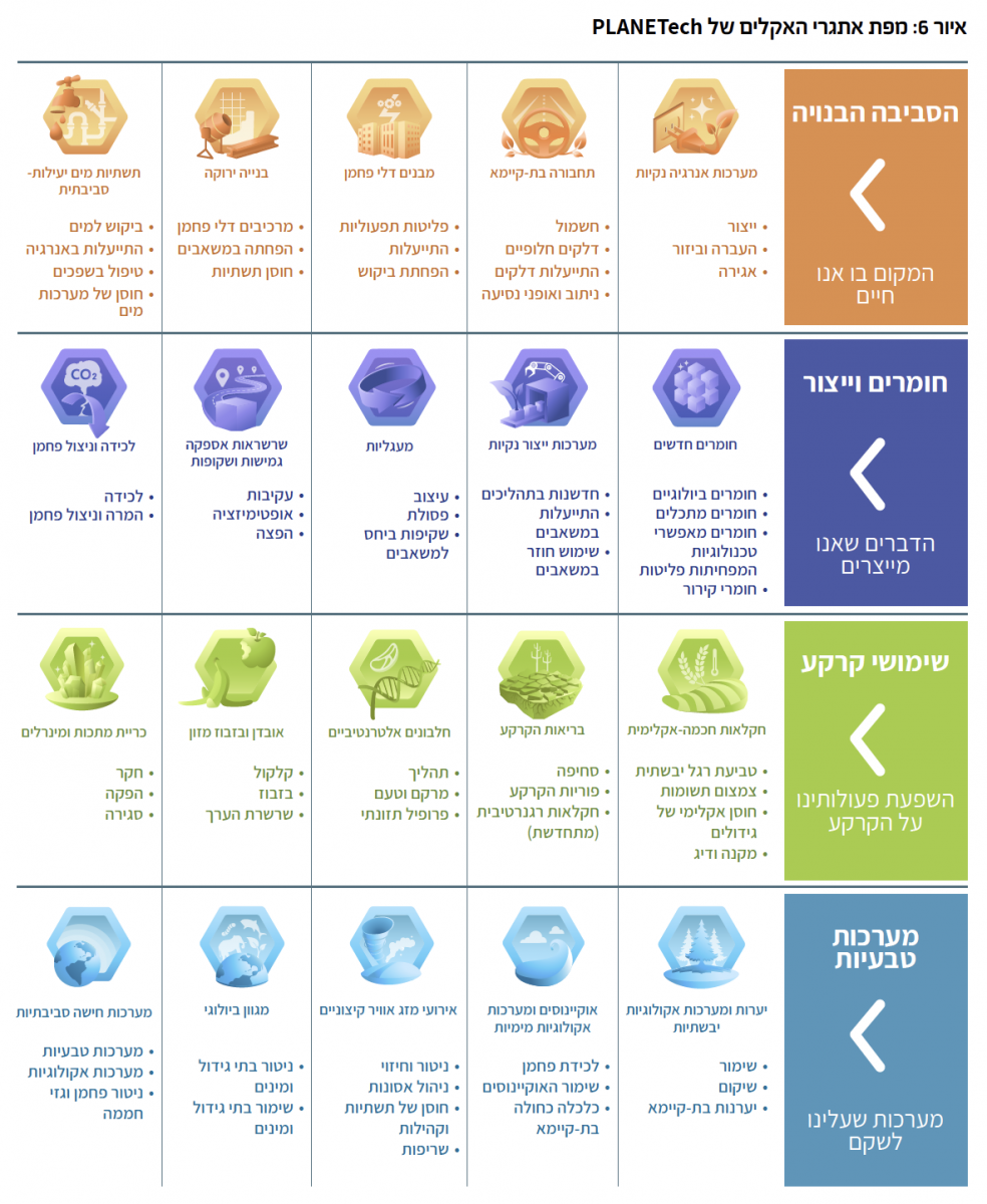 מפת אתגרי האקלים של PLANETech מציגה את האתגרים העיקריים במיטיגציה ואדפטציה לשינוי האקלים בכל מישורי חיי היומיום ובמרחבי הסביבה הטבעית. אתגרי האקלים מחולקים לארבעה תחומים עיקריים: הסביבה הבנויה, חומרים וייצור, שימושי קרקע ומערכות טבעיות; כל אחד מתחומים אלה מכיל חמישה אתגרים ובסך הכל 20 אתגרים (איור 6). חלוקה זו לאתגרים מציגה גישה רחבה ומקיפה יותר מאשר התמקדות בסקטורים ובשירותים כלכליים ספציפים. המיקוד באתגרים מאפשר להתרכז בפתרונות חדשניים ממגוון טכנולוגיות, הנותנות מענה לאתגרים ולתתי האתגרים. האתגרים מכוונים לצמצם מקורות פליטה, להגביר לכידת פחמן ולהעצים את חוסן הקהילה, הטבע והתשתיות.