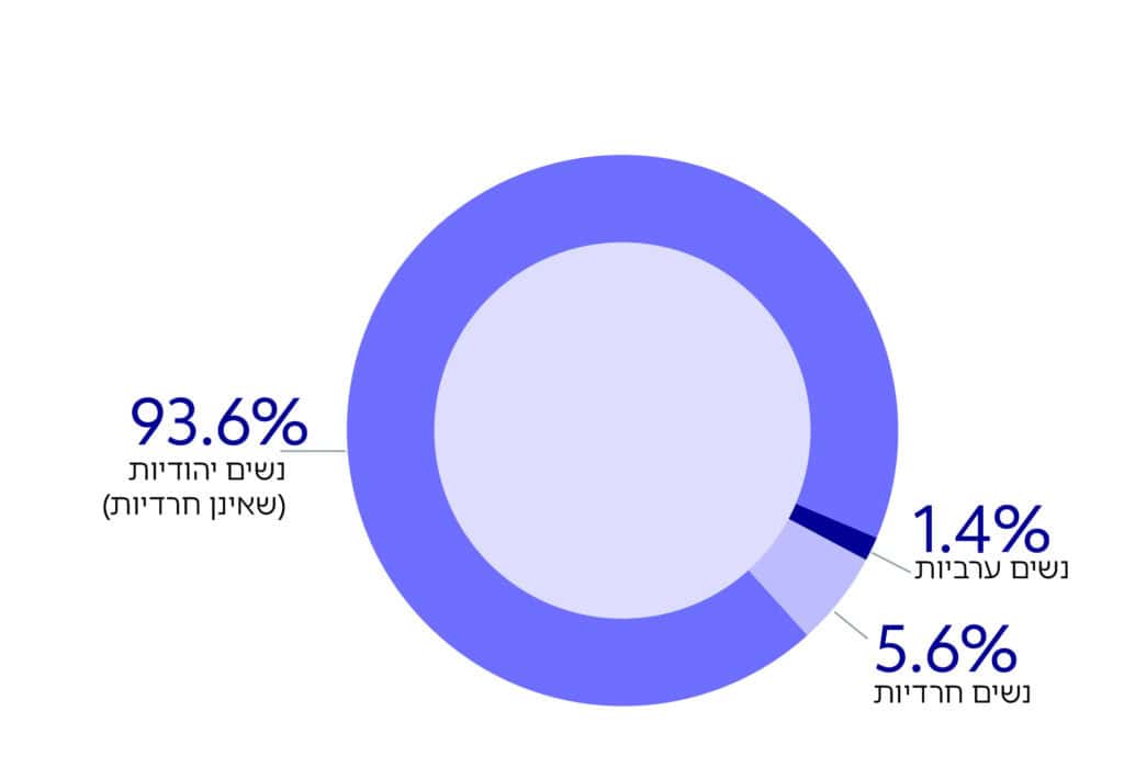 בחלוקה לפי אוכלוסיות, נשים יהודיות (לא חרדיות) הן 93% מהמועסקות בענף. נשים מהחברה החרדית הן 5.6% ונשים מהחברה הערבית – 1.4%.