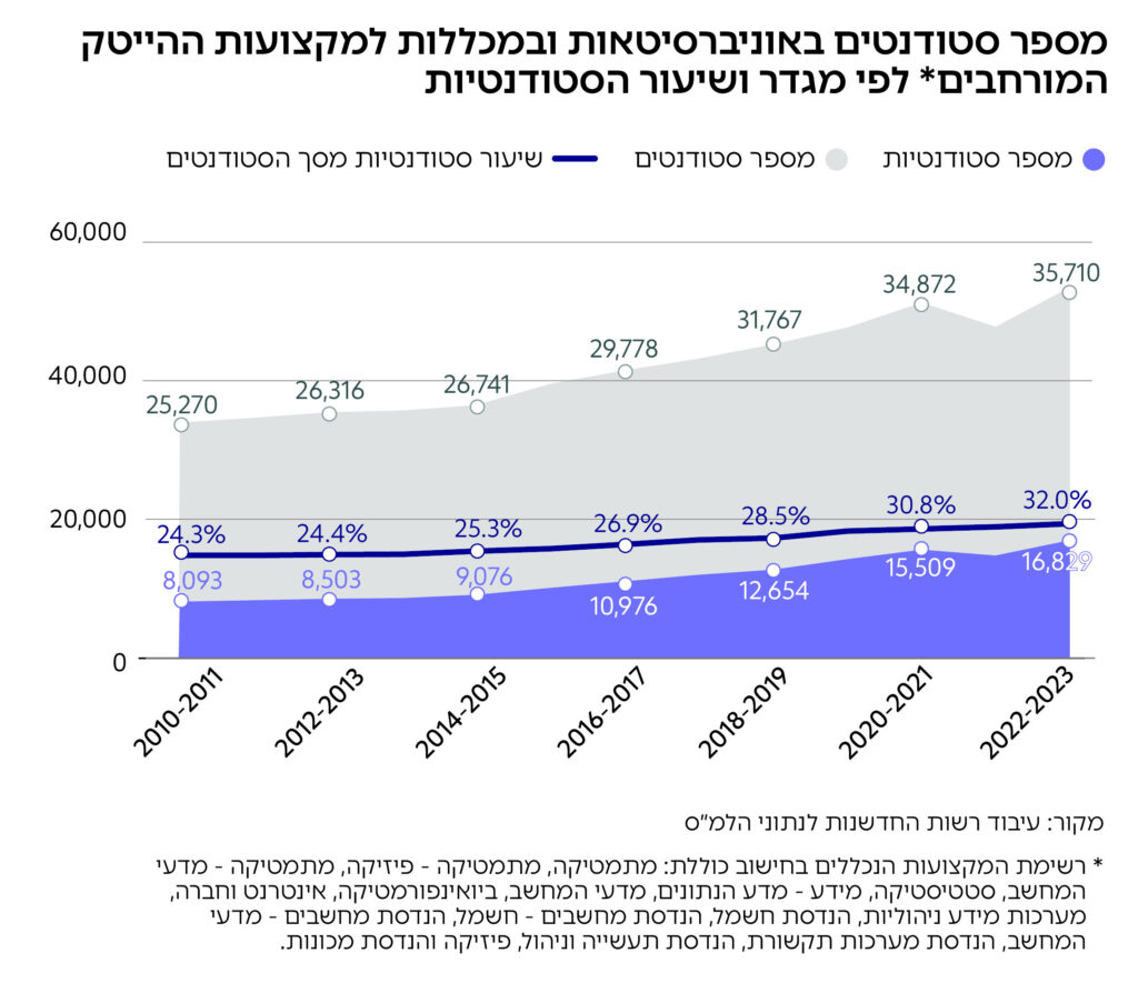- מספר הסטודנטיות למקצועות ההייטק הוכפל תוך עשור. שיעורן מכלל הסטודנטים נמצא במגמת עלייה – אך עדיין עומד על שליש בלבד
