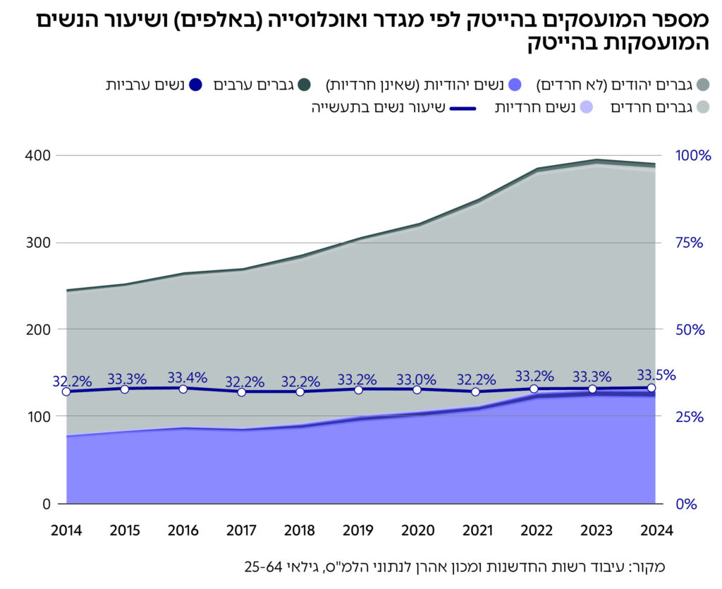 יחד עם זאת, חלקן היחסי של הנשים מכלל המועסקים בענף עלה בנקודת אחוז בלבד בעשור זה ועמד ב-2024 על 33.5% – כלומר, כמעט שאין בו שינוי.