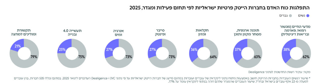 מניתוח נתוני הלינקדאין של עובדים ועובדות בחברות ההייטק הישראליות, עולה כי יש שונות בשיעור הנשים המועסקות בחברות בתחומים שונים. מהבדיקה עולה כי תחומי מדעי החיים (הכולל מכשור רפואי, פארמה ובריאות דיגיטלית) ותוכנה ארגונית, מסחר מקוון ותוכן מובילים בשיעור הנשים המועסקות בהן – כמעט 40% מכוח האדם.