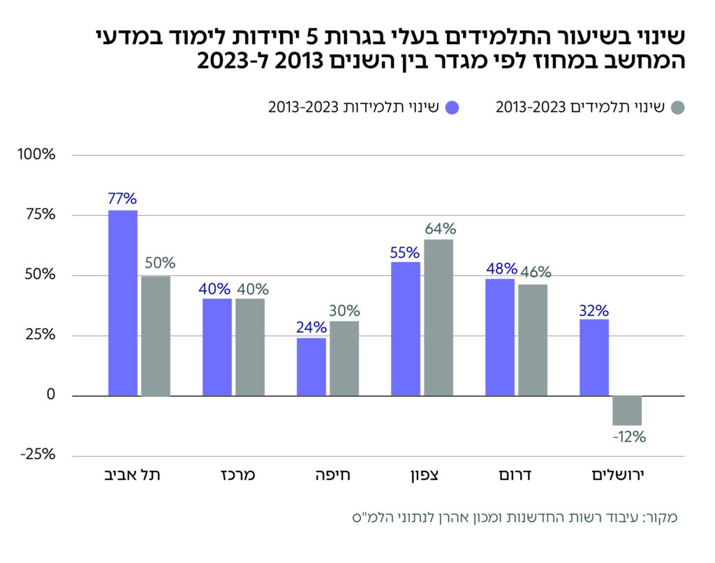 מחוז תל אביב מתבלט בשיעורי גידול גבוהים מהממוצע הארצי, שם קצב הגידול של תלמידות בעלות בגרות במדעי המחשב גדול בכמחצית מזה של תלמידים ( 77% ו 50%- בהתאמה). במחוז ירושלים, לעומת זאת, יש ירידה של 12% בשיעור התלמידים בעלי בגרות במדעי המחשב וגידול של 32% בשיעור התלמידות.