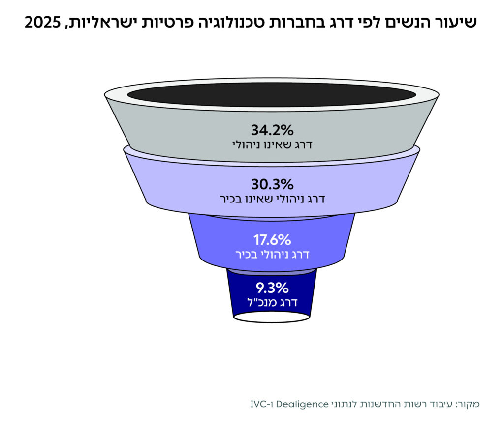 בדרג הניהולי שאינו בכיר בחברות במדגם שיעור המנהלות היה 30.3% – נמוך במעט בהשוואה לחלקן של נשים בדרג שאינו ניהולי בחברה, שעומד במדגם על 34.2%. בשלב הבא, בחינה של שיעור הנשים בדרג הניהולי הבכיר ( VP או C-Level), שיעור הנשים נחתך ויורד ל-17.6%. לבסוף, בקצה הפירמידה של חברות ההייטק הישראליות, נשים הן 9.3% מהמנכ"לים – כפי שיפורט בהמשך.