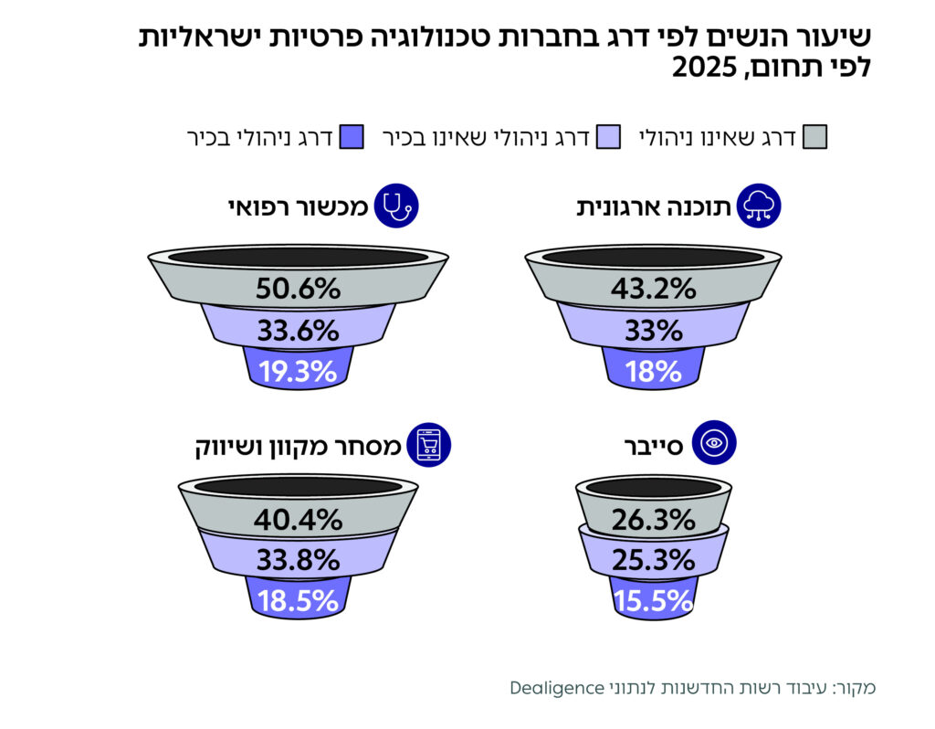 כלומר, נשים לא מתקדמות בסולם הדרגות הניהולי באופן יחסי לחלקן בתעסוקה בחברות. כך למשל, בתחום המכשור הרפואי, נשים הן מחצית מהעובדים בדרג שאינו ניהולי, אך בתפקידי ניהול בכיר שיעורן יורד ל-19.3%. בתחום הסייבר, בו נקודת הפתיחה פחות שוויונית, נשים הן 26.3% מהדרג שאינו ניהולי – ושיעורן יורד ל-15.5% בדרג הניהולי הבכיר.