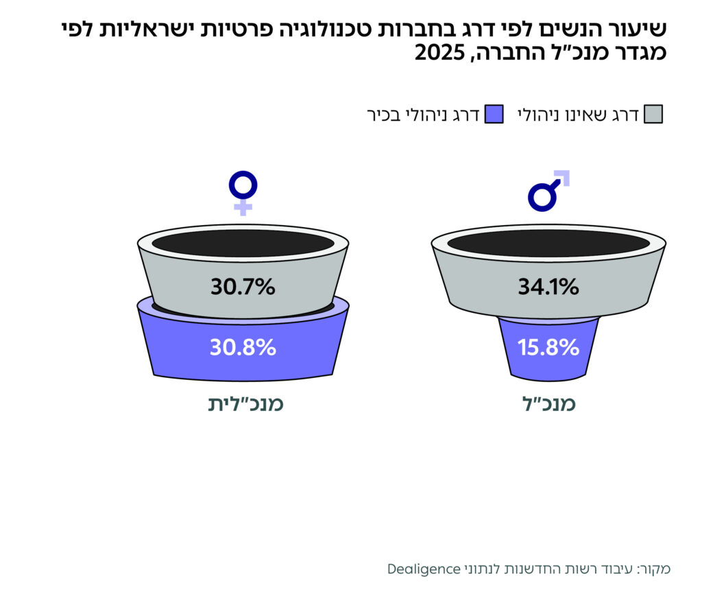 מעבר לייצוג הנשים הכולל בתעשיית ההייטק, נעשה ניתוח לבחינת ייצוג הנשים בתחום בתפקידים ניהוליים. זאת על מנת לבחון את מסלולי הקריירה והקידום של נשים בתעשייה ביחס לחלקן היחסי בתעסוקה בהייטק.1בחינת שיעורי הנשים בדרגים שאינם ניהוליים, דרג הניהול שאינו בכיר ודרג הניהול הבכיר נעשתה באמצעות ניתוח נתוני לינקדאין של עובדים ועובדות במדגם מייצג של חברות הייטק ישראליות על פי נתוני IVC ו-Dealigence העדכניים לינואר 2025. חישוב שיעור הנשים בדרג מנכ"ל מפורט בפרק היזמות בהמשך הפרסום.