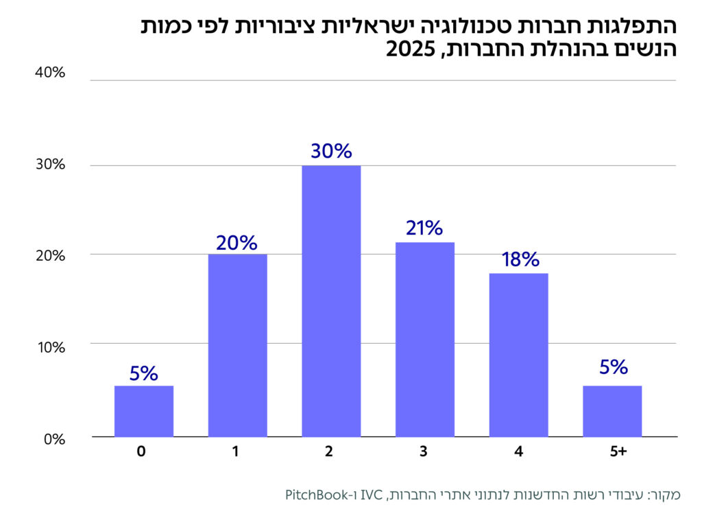 בשלוש חברות במדגם (5%) לא היו בכלל נשים בהנהלות. ב-20% מהחברות הייתה אישה אחת בהנהלה בלבד, ב-30% – שתי נשים, ב-21% – שלוש נשים, וב-23% – ארבע או יותר.