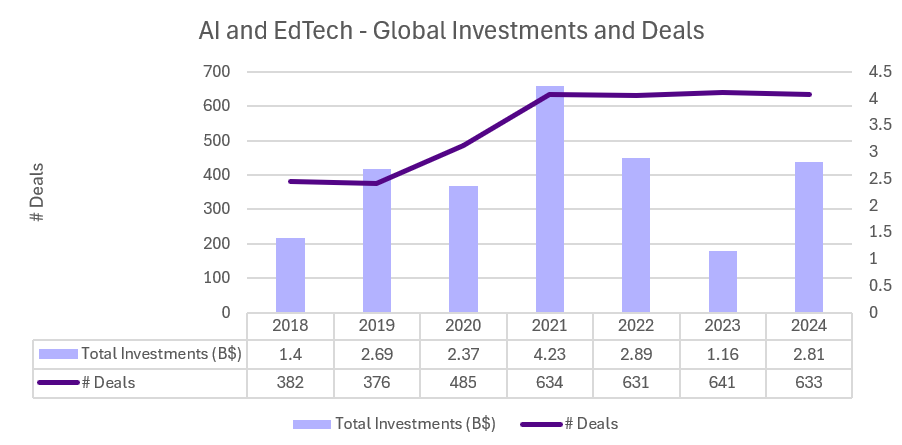 Since 2019, the field has experienced significant growth. Between 2019 and 2024, total investments in companies operating in AI-based EdTech reached USD 17.55 billion, across 3,782 transactions. Overall, cumulative investments in AI-integrated EdTech companies amount to approximately USD 20 billion, including all transactions and funding rounds since the early 1960s.