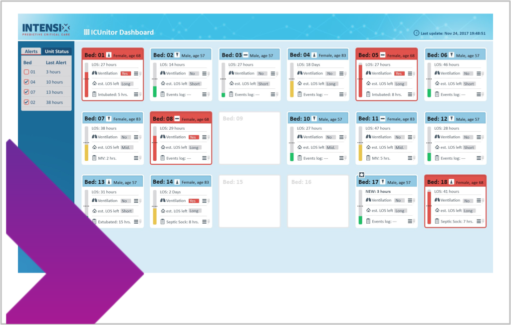 A patient in the intensive care unit is often sedated and on respiratory systems to enable easier care and to stabilize his condition. Occasionally, following several days of treatment, his medical condition may deteriorate, a process which may unfortunately end with his death or with significant long-term damage. The clinicians responsible for his care may not always discern the first signs of deterioration, however, if the patient is connected to a system developed by the Intensix Corporation, it will identify and warn of this risk and immediate care may be rendered, thereby saving his life. Intensix’s system gathers and monitors the clinical information on the patient’s medical condition – blood pressure, pulse, acidity level, oxygen saturation, laboratory data and others – and provides the doctors with real-time alerts about any deterioration in the patient’s condition. The system is designed to present a complete and clear situation report on each patient and to identify the patterns of deterioration internalized by the system using machine learning technologies. The situation report will help doctors provide the patients with the appropriate medical treatment, that in turn, will not only reduce the duration of the patient’s stay in the intensive care unit but will also enable his release in an improved condition.