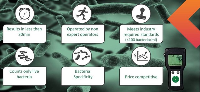 “Our technology can detect small concentrations of bacteria. Our goal is to identify as few as 100 bacteria per milliliter. That’s low density, but the industry would rather catch bacteria without waiting for them to multiply. The advantage of our product is that it produces results quickly and it’s easy to operate. And the beauty of our solution is that it can tell dead bacteria from live bacteria. By adjusting the chip, we can also target only a particular type of bacteria.