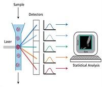 Flow cytometers contain three main systems—the fluidics, the optics, and the electronics. The fluidics system funnels a sample of cells (for example, a sample of human blood) into a single stream so that the cells pass one at a time through a laser beam. As each cell passes through the beam, it scatters light and may emit fluorescent light. These light signals are collected by the optics system and routed to various detectors. The signals received by the detectors then are converted into numerical values by the electronics system. Results can be displayed on the screen or saved for future analysis using specially designed software. As each cell moves through the beam, its parameters (characteristics) are measured and recorded, along with the time that it passed through the beam. Typically data is collected for at least 10,000 cells per sample. The basic principle of how flow cytometers operate is shown above.