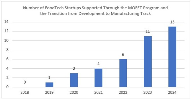 In parallel, the upward trend continues in the number of FoodTech companies applying through advanced manufacturing tracks – the MOFET Program and the Transition from Development to Manufacturing track (Figure 3). This positive trend is expected to lead at least some of these companies toward commercialization and local production in Israel.