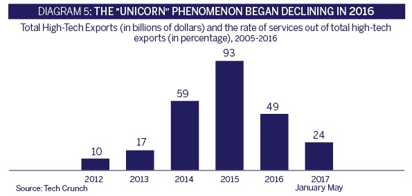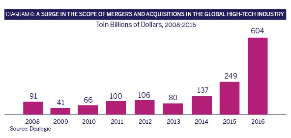 An additional global trend is the consolidation process occurring among the large technology companies. In 2016, a record number of merger and acquisition transactions was recorded in the international high-tech industry (see Diagram 6), including huge deals such as the acquisition of NXP by Qualcomm for USD 47 billion and the purchase of LinkedIn by Microsoft for USD 28 billion. There are those who claim that this trend may reduce the feasibility of strategic acquisition for young technology companies. This is because the abundance of giant mergers means a reduction in the number of potential buyers, and among those that remain – a depletion of cash reserves and the shifting of managerial attention to the application of integrational processes that accompany mergers.
