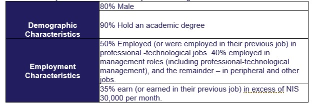 The respondents were asked about their employment situation (salaried employees, self-employed or unemployed), and about various employment characteristics such as the industry to which they work in, their salary range, the type of job/role in which they are employed, education and others. Among those who are unemployed, the survey examined different aspects of the difficulties in finding a new job. In addition, the respondents’ views with regard to the employment situation of older high-tech employees were also examined, including aspects such as obstacles to their employment and advisable solutions. This report provides initial findings from an analysis of the survey results on the basis of which the Innovation Authority will subsequently conduct a thorough study.