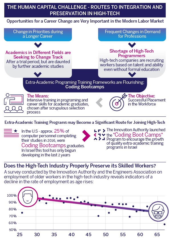 Increasing the number of skilled and experienced personnel in the high-tech industry is a national objective, and the State of Israel is acting to achieve it. To this end, the Innovation Authority is supporting the cultivation of “coding bootcamps” as an additional avenue for joining the industry and is examining the problem of high-tech employment among older age groups.