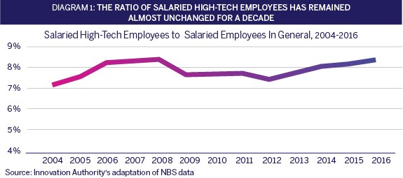 One of the central questions surrounding the discussion about the shortage of skilled high-tech employees is why it is that the high salary, that reflects the high demand for these workers, is not enough to attract more workers to choose this career path. The significance of the disparity between the average wage in the high-tech industry – NIS 21,000 per month – and the average wage in the economy at large – approximately NIS 9,8002 . This large difference becomes even more significant taking into account the complex high cost of living in Israel. Nonetheless, the figures indicate a more than decade-long stability in the ratio of salaried employees working in high-tech (see Diagram 1)3.compared to a thriving corporate demand for labor expressed by a constant increase in salaries.