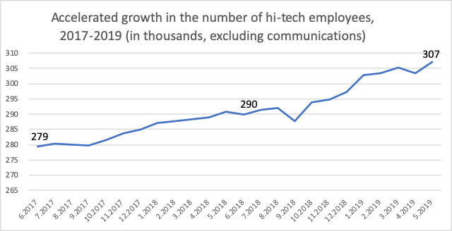Percentage of employees in Israel’s hi-tech industry rose to 8.7% by end of 2018, up from 8.3% at end of 2017, bringing number of hi-tech positions (not including the communications sector) to over 307,000 by mid-2019