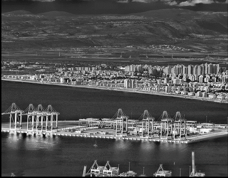 Below: Picture of Haifa Bay and the mountains of the Galilee from an infra-red sensor in the thermal field (MWIR), which constitutes the basis of the new technological development for applying hyperspectral sensing from space:
