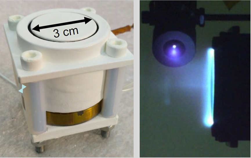 A picture of a microHet engine in action in a vacuum cell (right), picture of a prototype three-centimeter microHET engine (left)