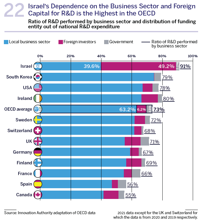 The importance of the high-tech sector and the innovation ecosystem to the Israeli economy stands out on a global level. In 2021, the level of national expenditure on R&D as a percentage of GDP stood at 5.6% – a total of 88 billion shekels – the highest level of national expenditure on R&D in the OECD. 91% of R&D in Israel is conducted by the private sector – the highest such ratio of all OECD countries. Furthermore, as we presented in the 2022 Annual Report, Israel recorded the lowest level of state funding of R&D among the OECD countries – only 9% of the national expenditure is funded by the state, including R&D conducted in academic institutions or with funding from the Innovation Authority, the various security bodies, and other government entities. State funding of R&D is particularly intended to provide a solution for high-risk R&D investments that constitute the basis for disruptive innovation and in which the private sector underinvests.