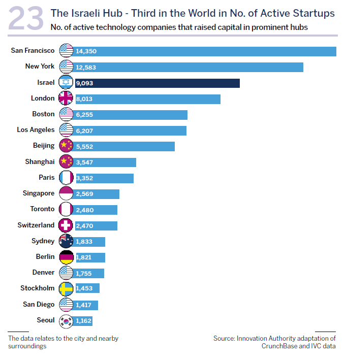 The significance for the startups and innovation hubs in Israel is that its competition is increasing, and not just with the major hubs with which it regularly competes for funding and personnel, primarily San Francisco – the largest ecosystem in terms of the number of companies and funding. The fiercest competition today is with smaller and rapidly growing ecosystems, mainly in Europe.