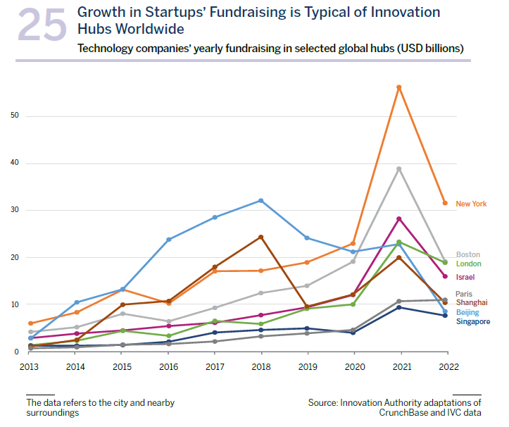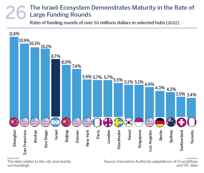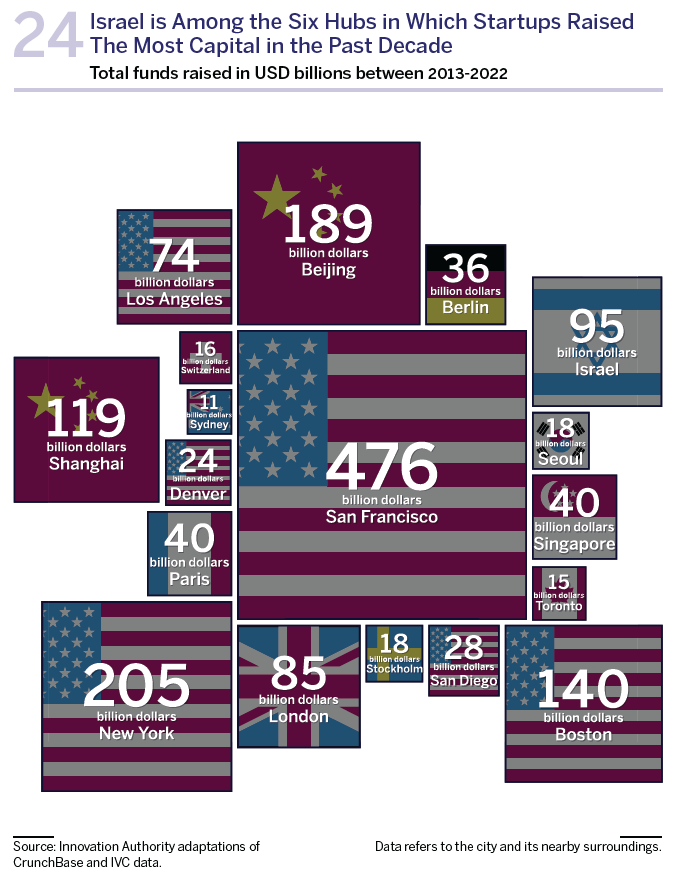 Israel has enjoyed phenomenal growth in startups’ fundraising over the past decade. An unprecedented sum of 95 billion dollars was raised by Israeli technology companies between 2013-2022, a figure which positions the Israeli innovation hub in 6th place in the world in terms of startups’ fundraising during this period. This is an especially impressive achievement considering the largest hubs that are ranked ahead of Israel and which are located in economic superpowers – the US and China.