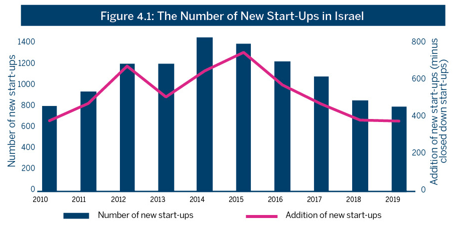 Analysis conducted by the Israel Innovation Authority indicates that recent years have shown a decline in the number of start-ups added to the Israeli innovation ecosystem. Figure 4.1 demonstrates that from 2012 to 2017, 1,000 new start-ups were established per year, with a net of 500 companies added to the high-tech industry per year (the sum of new start-ups after deducting those that closed). However, since 2015, there has been a decline in the number of new start-ups, with 800 new start-ups registered in Israel in 2019, a net addition of just 360 companies – the lowest number seen in a decade.