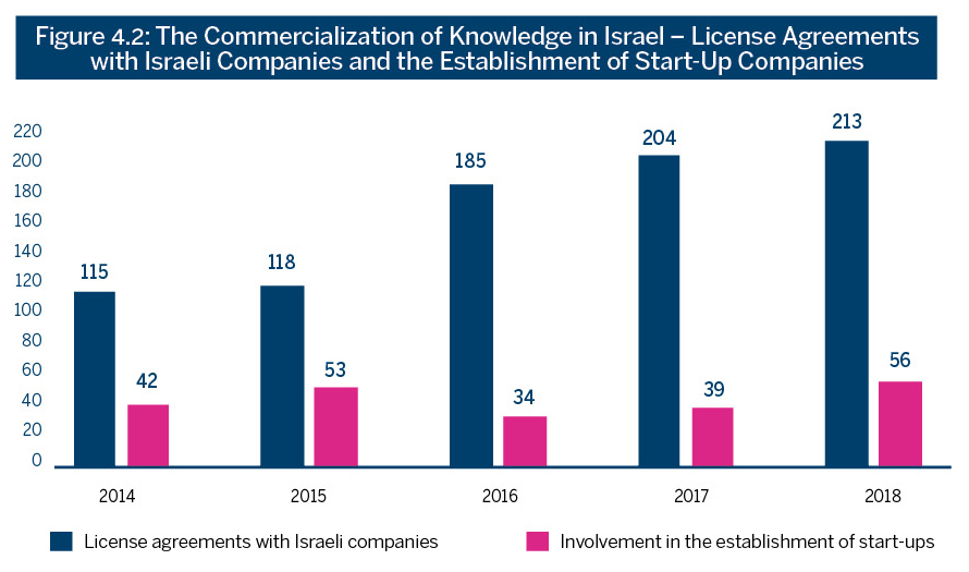 Academia plays a key role in the creation of innovative knowledge and groundbreaking ideas, and in developing concepts to the point they can be used to establish start-up companies. Consequently, mechanisms that support the transfer of knowledge and collaborations between academia and industry play a crucial role in the creation of new start-ups. In recent years, there has been a moderate uptick in the number of license agreements signed by research institutions with Israeli companies, and in the number of start-ups established by the institutions’ knowledge commercialization companies.