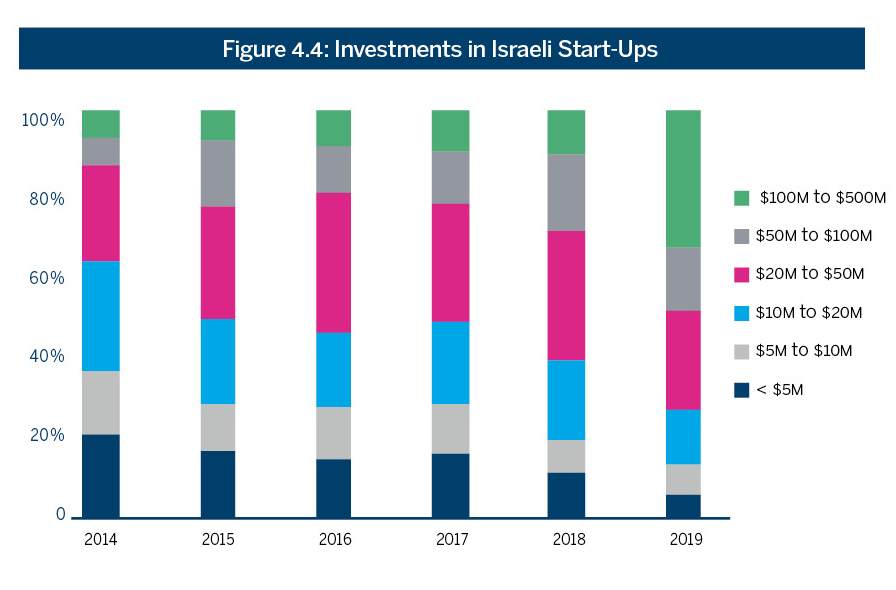 Figure 4.4 also shows that more and more investments are being diverted from seed companies to growth-stage companies. The amount of investments in Israeli start-ups valued at up to five million dollars has decreased both absolutely (from 853 million dollars in 2018 to 509 million dollars in 2019) and as a percentage of total investments in Israeli start-ups (from 11% to 6%, respectively).