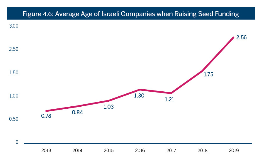Other trends observed both in Israel and the US are growth in the median sum raised in seed rounds and an increase in the age of the company at the time of the round. In 2014, the median sum of a seed-stage funding round in Israel was 750,000 dollars and 700,000 dollars in the US, while in 2019, the median sum raised in seed rounds was 2 million dollars in Israel6SNC data and 2.2 million dollars in the US.7Venture Pulse, Q3 2019 KPMG Furthermore, as demonstrated in Figure 4.6, companies took longer to begin to raise seed funding, with the average time between a company’s founding and its seed round growing from 10 months in 2014 to 29 months in 2019.8SNC and IVC data processed by the Israel Innovation Authority This trend was evident in the US, where the average age of companies raising seed capital increased from 29 months in 2017 to 36 months in 2018.9PitchBook data processed by the Israel Innovation Authority