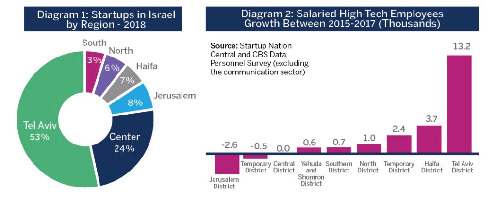 Most of the technological entrepreneurship in Israel is concentrated in the center of the country: the overwhelming majority of venture capital funds in Israel are located in the center, and 77% of all startup companies are located in the Tel Aviv and central regions (see Diagram 1).