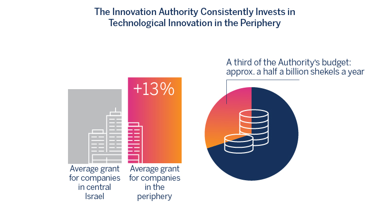 This policy was not created in a vacuum. For years, the Chief Scientist’s Bureau in the Ministry of Economy, from which the Innovation Authority was born, endeavored in a number of ways, to promote technological innovation in the periphery. Firstly, companies from all sectors located in the periphery8 received increased grants. Secondly, as part of the Technological Incubators Program, incubators operated, and still operate today, in a range of peripheral areas. Furthermore, large high-tech companies that established development centers in the periphery received special benefits. Approximately a third of the Authority’s annual grants budget was allocated in recent years to R&D activity in the periphery – a total of about half a billion shekels ($140 million) a year.