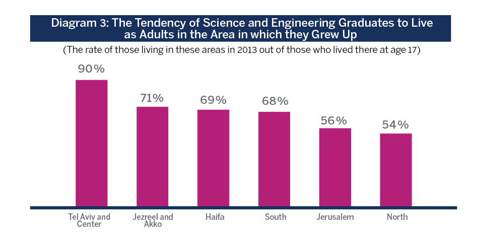 Many of those possessing high-tech academic education are interested in living in the Galilee or the negev for proximity to family, for quality of life or other reasons. Data gathered in the Chief Economist’s Bureau at the Ministry of Finance reveals that more than half the students of science and engineering studies returned after graduation to live as adults in the area in which they grew up (See Diagram 3). Furthermore, approximately only a quarter of science and engineering graduates who grew up in the Israeli peripheral areas move to live in the center as adults .Both universities and academic collegesIt should be pointed out that the tendency to remain in the same area throughout their lives is especially strong among the Arab population.