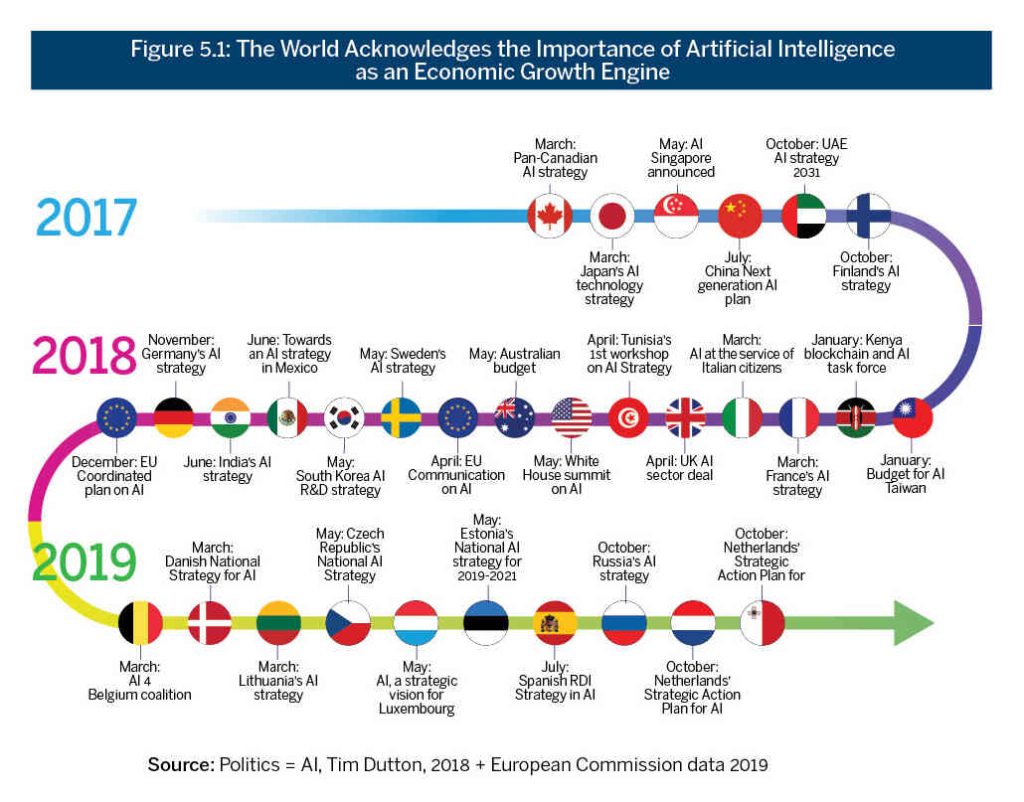 The 2018-2019 Innovation Report1Israel Innovation Authority, “The Race for Technological Leadership: The Advent of the Smart Machine Era.” Israel Innovation Authority Report, 2018-2019 included a survey conducted by the Israel Innovation Authority that delineated the heavy investment in AI made by nations such as China and other East Asian countries. Since then, the US, Europe, and other countries have revealed strategic plans aimed at advancing AI. Figure 5.1 shows a timeline of countries that have thrown their hat in the AI ring and announced national plans dedicated to AI.