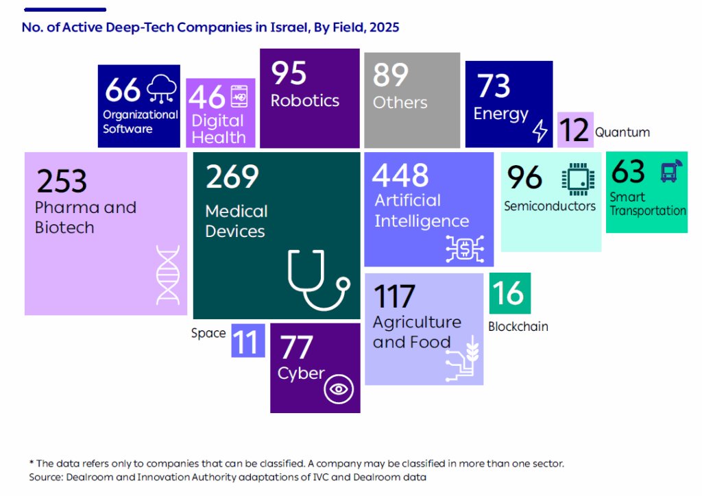 For the purpose of this publication, a deep-tech company is defined as a company developing complex technology that, due to the complexity of the R&D, is typically characterized by long maturation periods, and which usually requires highly educated and skilled human capital as well as significant financial resources to complete the development process.1For a more detailed definition, see the Israeli Deep-Tech Report 2025, jointly published by the Innovation Authority and Dealroom. The full publication presents the definition of an Israeli company and details regarding the overlap between the deep-tech and life sciences sectors.