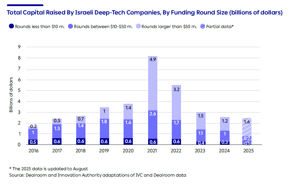 In 2024, about half the capital raised by Israeli deep-tech companies was in large rounds of more than USD 50 million – compared to only 10% in 2016.